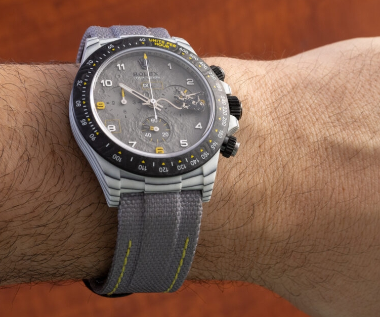 One of the less comfortable things about high quality clone Rolex watches like the Space Mission is you really don’t know where the Rolex ends and the aftermarket parts begin. Most of the movement is an original Rolex caliber 4130 (Rolex later updated the Daytona with the 4131 movement), though it has a special automatic rotor on it. I have a feeling that the original Rolex logo and hour markers are taken from an original dial, to be reused on the aftermarket “moon surface” dial. It is also possible that the crown and screw-down chronograph pushers are at least somewhat original (though they would not have been black in color originally), but otherwise, most of this Designa Individual watch looks to be in the form of a Rolex Daytona but is produced from different materials that Rolex does not currently use. For this watch, the materials include forms of carbon including NTPT layered carbon (made popular by use in Richard Mille watches) as well as other quartz fiber and carbon materials. This results in the layered black and white carbon case, and the black bezel with its organic texturing under the printed tachymeter indexes.