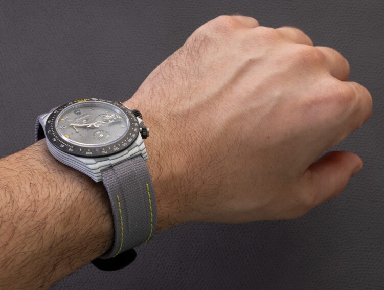 The strap attached to the 40mm wide case is produced by DiW and is a textile strap with a Velcro-style enclosure. I found it to be a bit too large for my wrist, and the nature of the enclosure isn’t such that it is particularly adjustable if your wrist is small to medium in size. With that said, as this is a bespoke watch made for individual clients, the strap would fit if the watch was made for me. The strap is lightweight and comfortable, but not super luxurious outside of the fact that it looks like a combo of a Rolex strap and similar Velcro-style straps for some Richard Mille timepieces. Overall the China replica Rolex watches are neat, though it does look like someone’s generative image AI answer to “Rolex Daytona + Richard Mille + Moon Astronaut in black, white, and gray with a yellow color accent.”